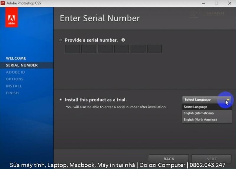 Bước 3: Chọn Install this product as a trial > Select Language > English rồi next