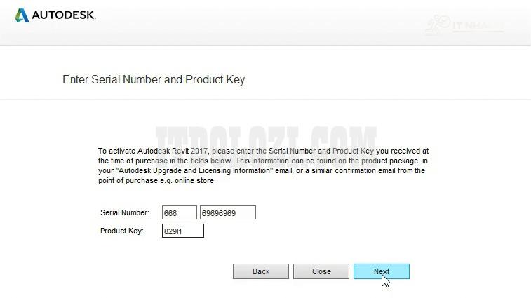 Nhập số Serial Number: 666_69696969 và Product Key: 829I1 rồi ta nhấn Next.