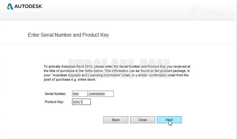 Ta nhập số Serial Number Revit 2018: 666_69696969 và Product Key: 829J1 rồi ta nhấn Next.