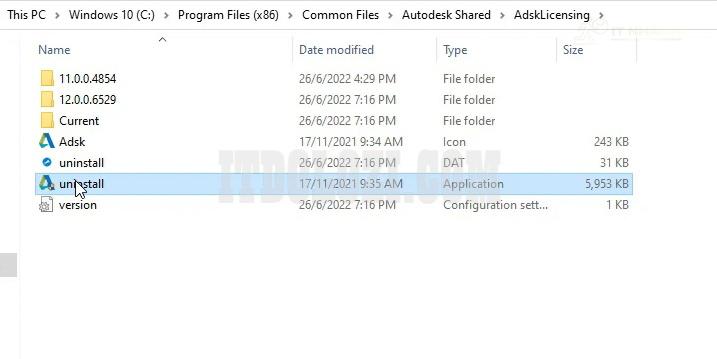 Bước 1: Truy cập đường dẫn sau: C:Program Files (x86) Common FilesAutodesk SharedAdskLicensing. Sau đó, chạy uninstall.exe để xóa giấy phép của Autodesk trước.