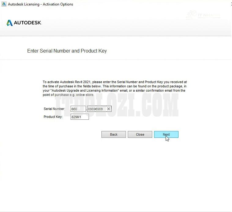 Bước 4: Nhập Serial Number: 666_69696969 và Product Key: 829M1, sau đó nhấn Next.