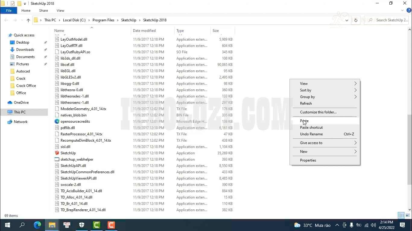 Bước 2: Dán 3 file vừa copy vào thư mục cài đặt Sketchup 2018