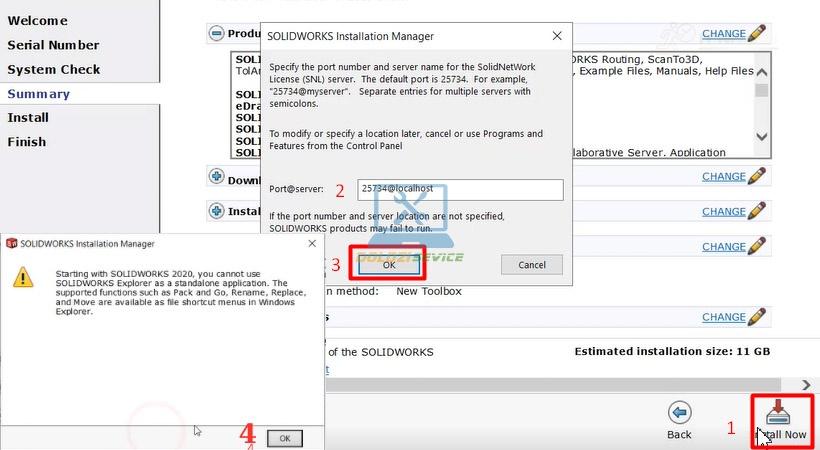Bước 9: Chọn “Install Now”, nhập “Port@server” và nhấn “OK”