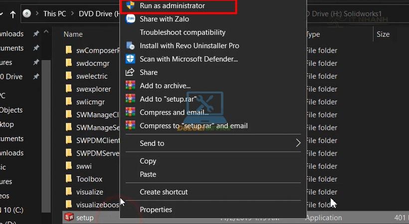 Bước 5: Chạy file “Setup.exe” để bắt đầu cài đặt Solidworks 2019